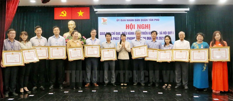 Đồng chí Lê Thị Kim Hồng, Bí thư Quận ủy trao Bằng khen của UBND TP cho các tập thể đạt danh hiệu Tập thể hoàn thành xuất nhiệm vụ 2 năm 2019 – 2020.(Thanhuytphcm.vn) - Ngày 6/4, quận Tân Phú tổ chức Hội nghị giao ban chỉ đạo, điều hành phát triển kinh tế - xã hội quý I/2021 và phát động phong trào thi đua năm 2021. Đồng chí Phạm Minh Mẫn, Phó Bí thư Quận ủy, Chủ tịch UBND quận và các đồng chí Thường trực UBND quận chủ trì hội nghị. Tham dự có đồng chí Lê Thị Kim Hồng, Bí thư Quận ủy cùng các đồng chí Thường trực Quận ủy, Thường trực HĐND quận;…