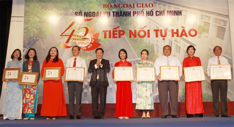 Các tập thể và cá nhân nhận Bằng khen của UBND TPHCM. (Ảnh: Thanh Vũ)Chúc mừng thành tựu 45 năm qua của Sở Ngoại vụ TPHCM, Phó Thủ tướng, Bộ trưởng Bộ Ngoại giao Phạm Bình Minh cũng mong rằng Sở tiếp tục phát huy truyền thống 45 năm xây dựng và trưởng thành để tiếp tục thực hiện tốt các nhiệm vụ mà Bộ Ngoại giao và TPHCM giao phó. Trong đó, cần tăng cường và nâng cao hiệu quả công tác tham mưu, làm tốt vai trò cầu nối cho Bộ và Thành ủy, UBND TPHCM trong công tác đối ngoại và hội nhập quốc tế. Sở Ngoại vụ cần nắm chắc nhu cầu của TP và các địa phương, tăng cường và nâng cao chất lượng tham mưu cho Bộ về chủ trương, giải pháp hội nhập quốc tế hiệu quả, nhất là hội nhập kinh tế quốc tế, tận dụng tốt cơ hội, kịp thời tháo gỡ khó khăn, vướng mắc cho địa phương, doanh nghiệp trong tiến trình hội nhập quốc tế.