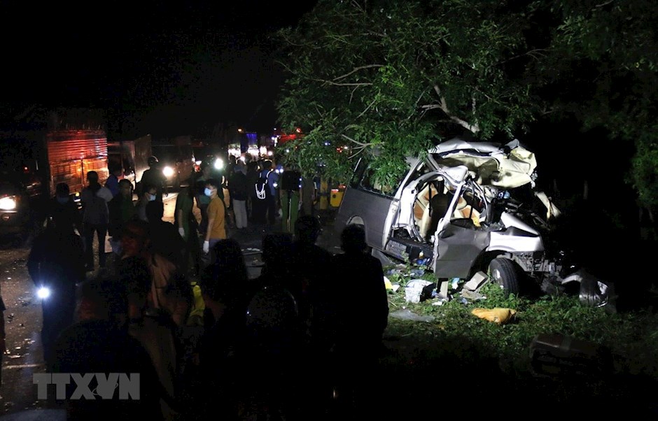Hiện trường vụ tai nạn. Ảnh: TTXVN(Thanhuytphcm.vn) - Khoảng 1 giờ sáng 21/7, một vụ tai nạn giao thông đặc biệt nghiêm trọng đã xảy ra tại Km 1767 trên quốc lộ 1A đoạn qua xã Tân Đức, huyện Hàm Tân, tỉnh Bình Thuận. Xe ô tô khách 16 chỗ mang biển kiểm soát 86B – 010.87 điều khiển đã va chạm với xe ô tô tải mang biển kiểm soát 79N - 0315 điều khiển đi theo hướng ngược lại. Vụ tai nạn làm 6 nạn nhân tử vong tại chỗ, 2 nạn nhân tử vong tại bệnh viện, 7 người bị thương. Nguyên nhân ban đầu vụ tai nạn được xác định do ô tô khách 16 chỗ đi không đúng phần đường quy định.