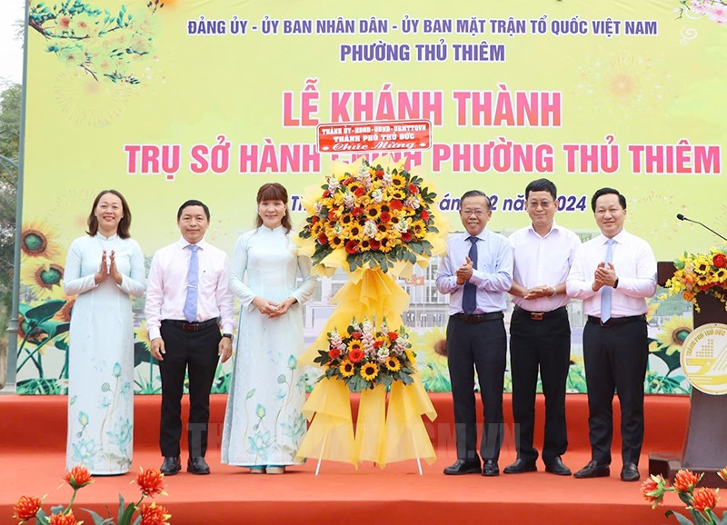 Lãnh đạo TP Thủ Đức tặng hoa chúc mừng Đảng ủy, UBND phường Thủ Thiêm.(Thanhuytphcm.vn) - Sáng 31/12, Đảng ủy, UBND, Ủy ban MTTQ Việt Nam phường Thủ Thiêm tổ chức lễ khánh thành trụ sở hành chính phường.