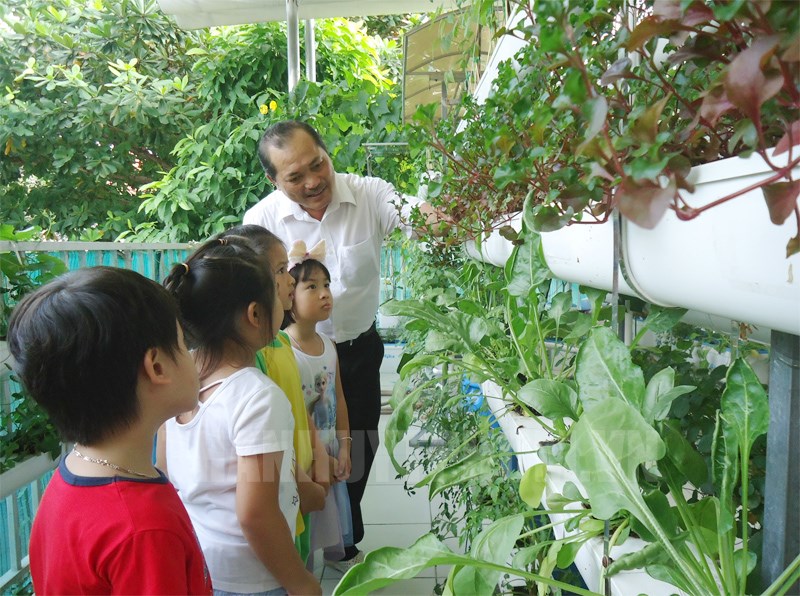 Thầy Lương Trọng Bình cùng các học sinh nhỏ tại vườn cây 4.0 của trường.(Thanhuytphcm.vn) - Trong không khí tri ân đang tràn ngập những ngày cuối tháng 11, nhiều câu chuyện về những người thầy, người cô ngày đêm thầm lặng đóng góp cho sự nghiệp trồng người lại được nhắc đến. Trong số đó có thầy giáo vui tính Lương Trọng Bình, Hiệu trưởng Trường Mầm non Hoa Mai (Quận 3).