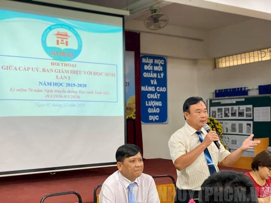 Thầy Võ Ngọc Sơn phát biểu trong buổi đối thoại giữa Cấp ủy, Ban Giám hiệu nhà trường với học sinh(Thanhuytphcm.vn) - Một cán bộ mẫu mực, một đảng viên tận tụy, gương mẫu… Đó chính là thầy Võ Ngọc Sơn, Bí thư Chi bộ, Hiệu trưởng Trường THPT Hàn Thuyên, quận Phú Nhuận, TPHCM.