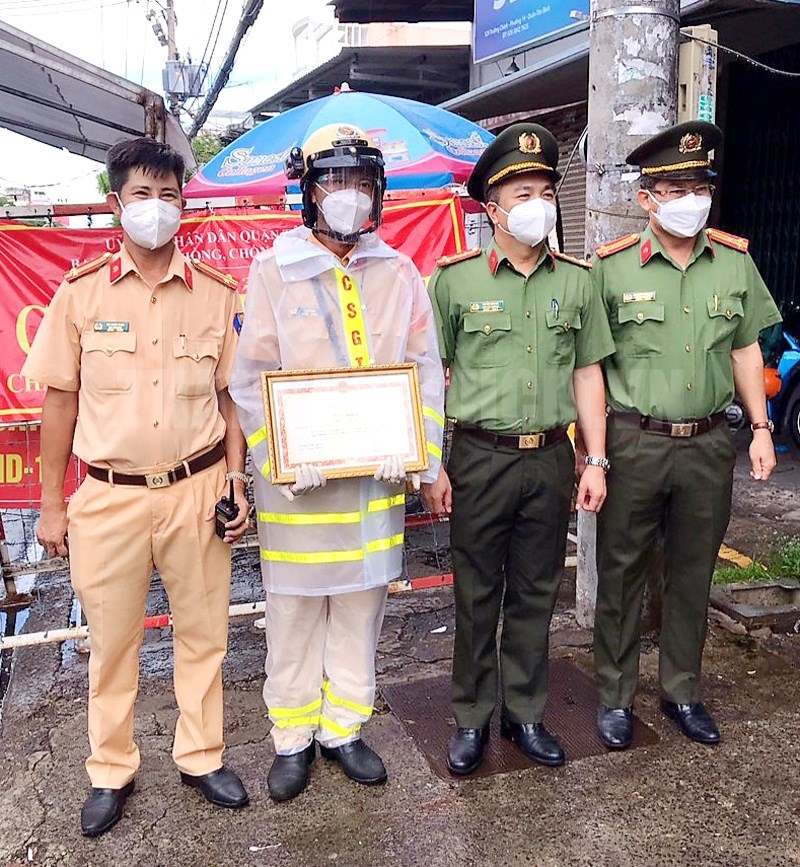 Đại tá Hoàng Văn Hà trao Bằng khen của Bộ trưởng Bộ Công an cho Thiếu tá Lê Hoàng. (Ảnh: Đức Vượng)(Thanhuytphcm.vn) - Chiều 9/9, đoàn kiểm tra công tác phòng chống dịch Covid-19 của Bộ Chỉ huy tiền phương do Đại tá Hoàng Văn Hà, Phó Cục trưởng Cục An ninh điều tra Bộ Công an đã đến kiểm tra công tác kiểm soát phòng chống dịch tại điểm chốt kiểm soát trên tuyến đường Trường Chinh, Phường 13, quận Tân Bình và trao Bằng khen của Bộ trưởng Bộ Công an cho Thiếu tá Lê Hoàng, cán bộ Đội Cảnh sát Giao thông trật tự, Công an quận Tân Bình vì đã có thành tích xuất sắc trong công tác đảm bảo an ninh trật tự và phòng chống dịch Covid-19.