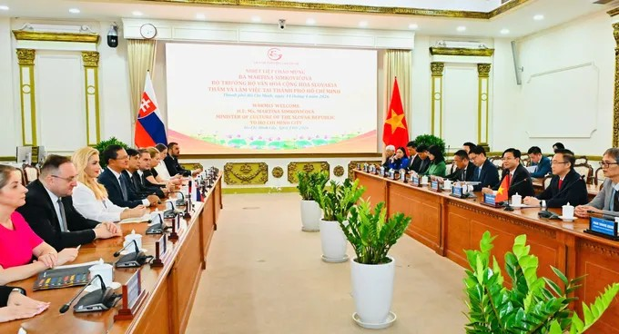 Phó Bí thư Thành ủy TPHCM Đặng Minh Thông tặng quà lưu niệm đến Bộ trưởng Bộ Văn hóa Slovakia. (Ảnh: SGGP)Năm 2025 là dấu mốc đặc biệt khi hai nước kỷ niệm 75 năm thiết lập quan hệ ngoại giao. Sự kiện nâng cấp quan hệ lên Đối tác Chiến lược vào tháng 4/2026, cùng việc tổ chức Diễn đàn Doanh nghiệp Việt Nam - Slovakia tại Hà Nội, Diễn đàn Kinh tế Slovakia - Việt Nam diễn ra ngày 15/4 tại TPHCM là minh chứng cho sự hợp tác bền chặt và hiệu quả giữa hai quốc gia.