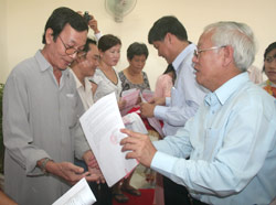 Quận 8 cũng tặng thêm mỗi gia đình một cây quạt gió trị giá 200.000 đồng. Thay mặt lãnh đạo TP, Phó Bí thư Thành ủy TP Nguyễn Văn Đua cũng trao tặng mỗi hộ 3 triệu đồng.