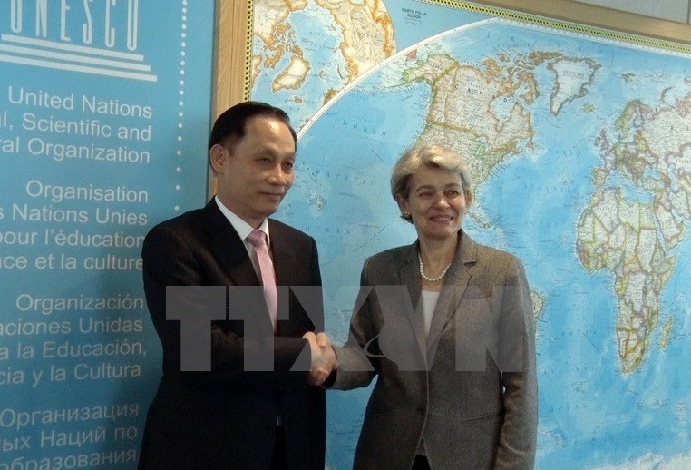 Tổng Giám đốc UNESCO Irina Bokova tiếp Thứ trưởng Ngoại giao Lê Hoài Trung, Chủ tịch Ủy ban Quốc gia UNESCO Việt Nam, Trưởng đoàn Việt Nam tham dự Khóa họp Hội đồng Chấp hành UNESCO. (Ảnh: TTXVN)