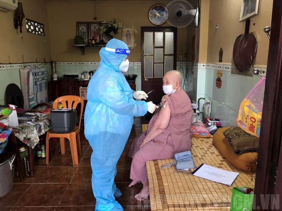 Nhân viên y tế tiêm vaccine phòng Covid-19 cho người trên 65 tuổi có bệnh lý nền và không đi lại được(Thanhuytphcm.vn) - Nhằm kiểm soát dịch, không để lây lan trong cộng đồng, chiều 24/8, Đoàn Thanh niên phối hợp nhân viên y tế phường Tăng Nhơn Phú A hỗ trợ hướng dẫn người dân tự test nhanh tại nhà theo hướng dẫn của Trung tâm Kiểm soát bệnh tật TPHCM.