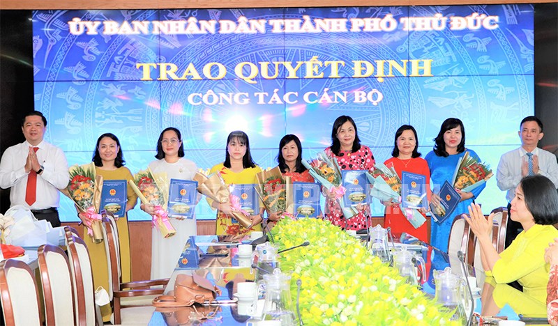 Theo đó, điều động, bổ nhiệm viên chức lãnh đạo, quản lý đối với: Phó trưởng phòng GD-ĐT TP Thủ Đức Phan Thị Kim Duyên giữ chức vụ Hiệu trưởng Trường Mầm non Long Bình; Hiệu Trưởng Trường Mầm non Long Bình Trần Thị Phương Thảo giữ chức vụ Hiệu trưởng Trường Mầm non Hiệp Phú; Hiệu trưởng Trường Mầm non Vành Khuyên 3 Huỳnh Thị Nhi giữ chức vụ Hiệu trưởng Trường Mầm non Hoa Mai; Hiệu trưởng Trường Tiểu học Linh Tây Nguyễn Thị Kim Luyến giữ chức vụ Hiệu trưởng Trường Tiểu học Trần Văn Vân; bà Trần Mỹ Lệ, Hiệu trưởng trường Tiểu học Trần Văn Vân giữ chức vụ Hiệu trưởng Trường Tiểu học Linh Tây; bà Đỗ Thị Hằng, Hiệu trưởng Trường Tiểu học Nguyễn Văn Banh giữ chức vụ Hiệu trưởng Trường Tiểu học Xuân Hiệp; bà Dương Thị Lệ, Hiệu trưởng Trường Tiểu học Xuân Hiệp giữ chức vụ Hiệu trưởng Trường Tiểu học Đào Sơn Tây; bà Hà Thụy Thúy Bình, Hiệu trưởng Trường Tiểu học Đào Sơn Tây giữ chức vụ Hiệu trưởng Trường Tiểu học Nguyễn Văn Banh; bà Phạm Ngọc Lan, Hiệu trưởng Trường Tiểu học Lê Văn Việt giữ chức vụ Hiệu trưởng Trường Tiểu học Đinh Tiên Hoàng; ông Nông Quốc Tuấn, Phó hiệu trưởng Trường THCS Bình Thọ giữ chức vụ Hiệu trưởng trường THCS Xuân Trường; bà Hoàng Thị Kim Dung, Giáo viên Trường Tiểu học Huỳnh Văn Ngỡi giữ chức vụ Phó Hiệu trưởng Trường Tiểu học Nguyễn Thị Tư; đồng thời, phân công bà Đặng Thị Ánh Minh phụ trách và điều hành Trường Tiểu học Lê Văn Việt; bà Nguyễn Thị Tuyết Anh phụ trách và điều hành Trường Mầm non Vành Khuyên 3.