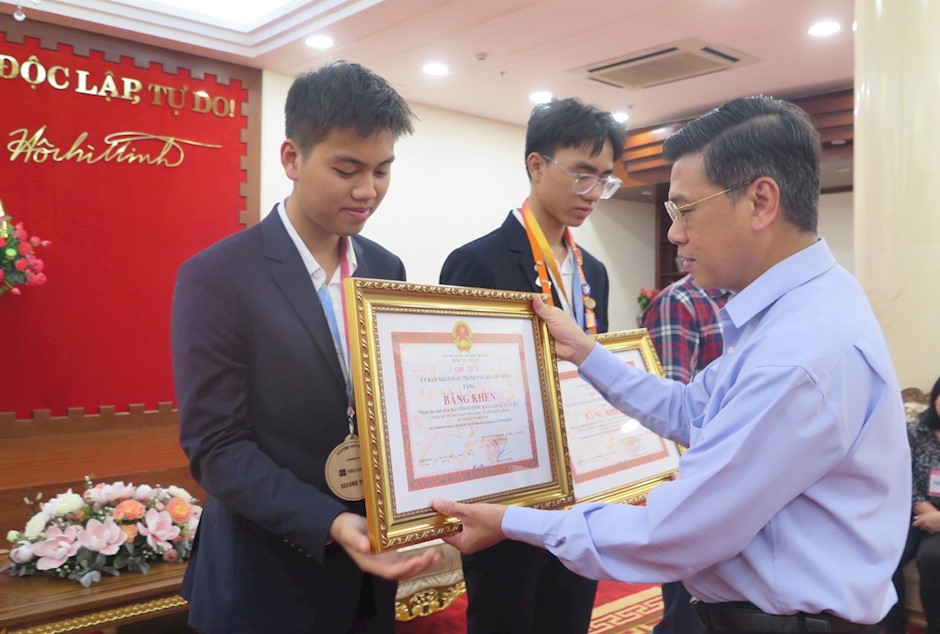 Để ghi nhận và biểu dương thành tích xuất sắc của nhóm học sinh và giáo viên Trường THPT chuyên Lê Hồng Phong, Chủ tịch UBND TPHCM đã quyết định trao tặng bằng khen của UBND TPHCM đối với 2 học sinh gồm Nguyễn Lê Quốc Bảo, Lê Tuấn Hy và thầy Đỗ Quốc Minh Triết, giáo viên trực tiếp hướng dẫn dự án đạt giải.