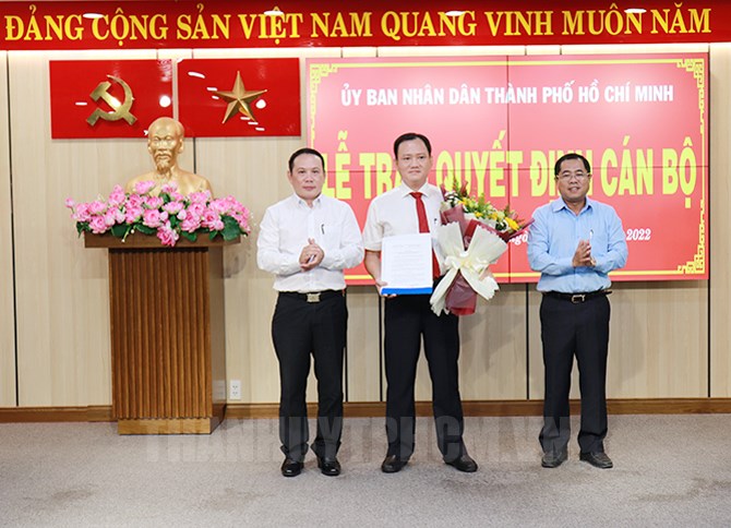 Đồng chí Dương Hồng Nhân, Bí thư Đảng ủy, Chủ tịch Hội đồng thành viên SAWACO và đồng chí Lâm Hùng Tấn, Phó Giám đốc Sở Nội vụ TPHCM trao quyết định và tặng hoa chúc mừng đồng chí Lâm Tứ Duy(Thanhuytphcm.vn) - Sáng 8/6, Tổng Công ty Cấp nước Sài Gòn (SAWACO) đã tổ chức Lễ công bố Quyết định của UBND TPHCM về bổ nhiệm người quản lý doanh nghiệp Nhà nước.