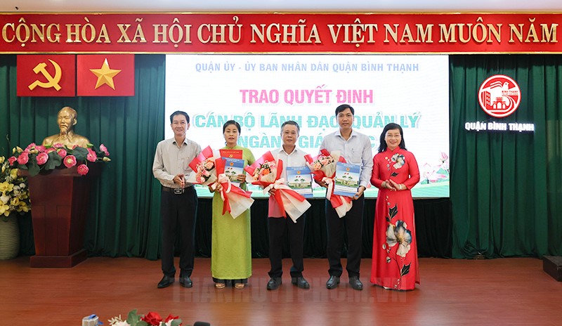 Lãnh đạo quận trao quyết định chỉ định Bí thư Chi bộ và quyết định điều động bổ nhiệm cán bộ lãnh đạo quản lý.(Thanhuytphcm.vn) - Sáng 7/2, Quận ủy, UBND quận Bình Thạnh tổ chức lễ trao quyết định cán bộ quản lý ngành giáo dục. Đồng chí Phan Văn Định, Ủy viên Ban Thường vụ Quận ủy, Trưởng Ban Tổ chức Quận ủy và đồng chí Thái Thị Hồng Nga, Ủy viên Ban Thường vụ Quận ủy, Phó Chủ tịch UBND quận chủ trì buổi lễ.