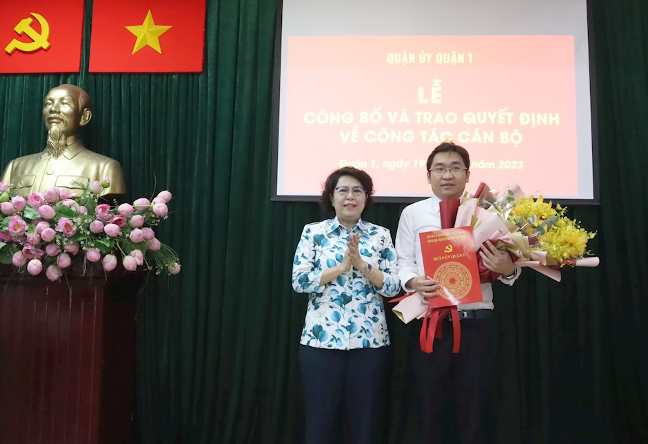 Đồng chí Tô Thị Bích Châu trao quyết định chỉ định Bí thư Đảng ủy phường Cầu Ông Lãnh(Thanhuytphcm.vn) - Ngày 19/4, Quận ủy Quận 1 tổ chức Lễ công bố và trao Quyết định về công tác cán bộ. Tham dự có các đồng chí: Tô Thị Bích Châu, Ủy viên Ban Thường vụ Thành ủy, Bí thư Quận ủy Quận 1; Hoàng Thị Tố Nga, Phó Bí thư Thường trực Quận ủy; Tạ Hoài Nam, Ủy viên Ban Thường vụ Quận ủy, Trưởng Ban Tổ chức Quận ủy…