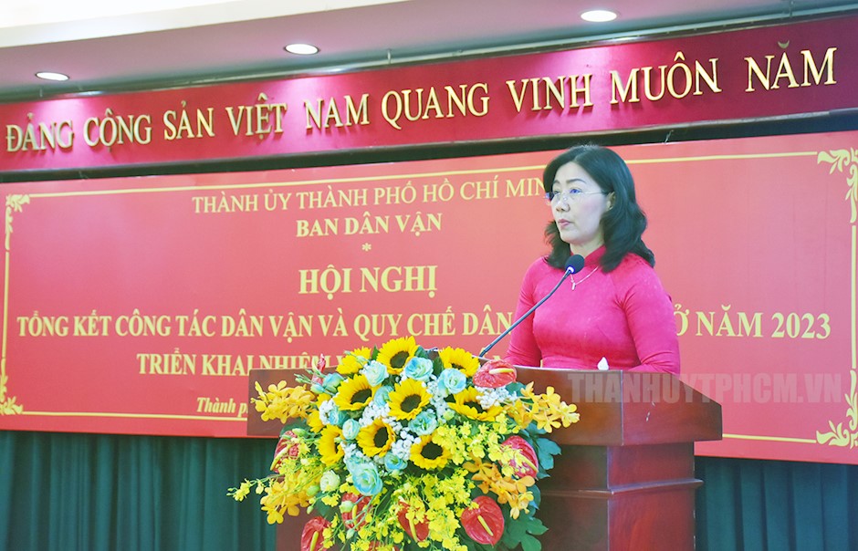 Báo cáo tại Hội nghị, đồng chí Nguyễn Thị Bạch Mai, Thành ủy viên, Phó trưởng Ban Thường trực Ban Dân vận Thành ủy TPHCM cho biết, Ban Dân vận Thành ủy đã triển khai đồng bộ nhiều nội dung công tác dân vận, quy chế dân chủ ở cơ sở, công tác dân tộc - tôn giáo, xây dựng quan hệ lao động hài hòa, ổn định và tiến bộ trong tình hình mới; qua đó hoàn thành khối lượng công việc nhiều, phức tạp, bảo đảm kế hoạch cũng như nhiệm vụ đột xuất; chủ động hơn trong phát hiện vấn đề, kịp thời hơn trong tham mưu những nội dung mới và khó, góp phần tiếp tục đổi mới, nâng cao chất lượng, hiệu quả công tác dân vận trong tình hình mới.