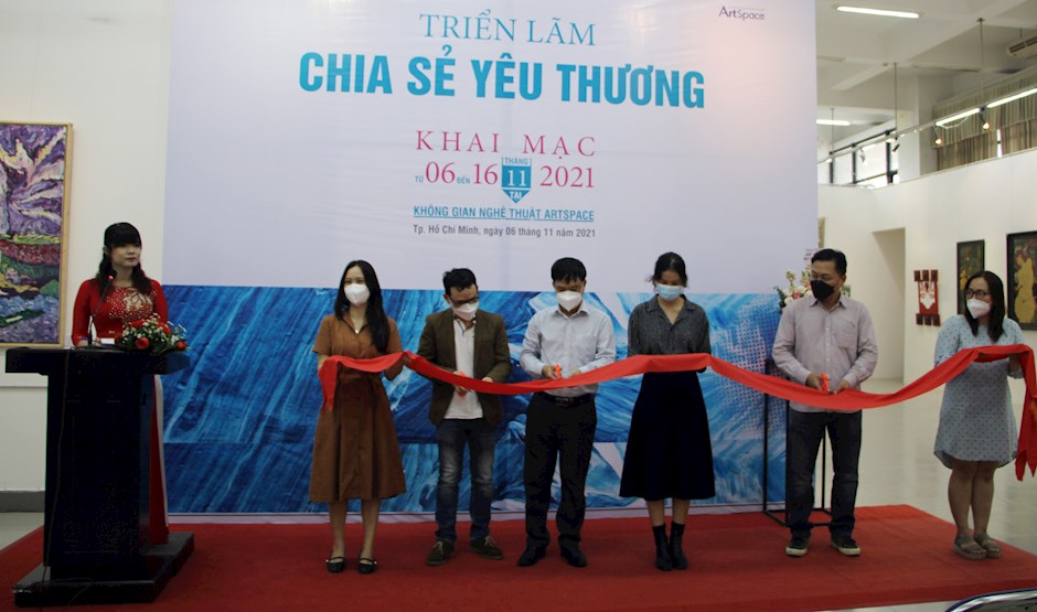 Các đại biểu cắt băng khai mạc triển lãm(Thanhuytphcm.vn) - Chiều 6/11, Trường Đại học (ĐH) Mỹ thuật TPHCM khai mạc triển lãm tranh “Chia sẻ yêu thương”. Hoạt động nhằm gây quỹ hỗ trợ sinh viên Trường có hoàn cảnh khó khăn, bị ảnh hưởng dịch bệnh Covid-19. Tham dự chương trình có Họa sĩ Siu Quý, Phó Chủ tịch Thường trực Hội Mỹ thuật TPHCM; đồng chí Lê Văn Duẩn, Phó Bí thư Đảng ủy, Phó Hiệu trưởng Trường.