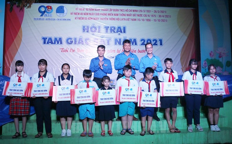 Các đồng chí lãnh đạo tặng quà cho thiếu nhi có hoàn cảnh khó khăn.(Thanhuytphcm.vn) - Tối ngày 24/4, Huyện đoàn Củ Chi, Đoàn Thị xã Bến Cát, Bình Dương và Đoàn Thị xã Trảng Bàng, Tây Ninh đã tổ chức “Hội trại tam giác sắt” dành cho hơn 150 đoàn viên thanh niên 3 đơn vị.