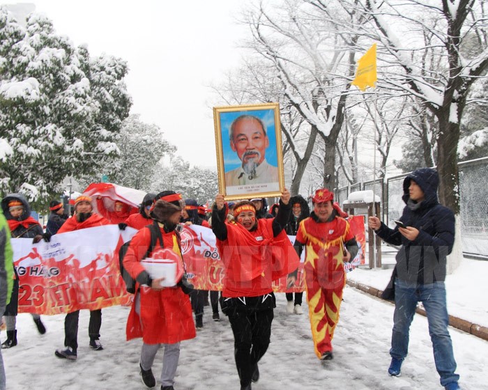 Trong không gian trắng xóa của một bầu trời tuyết, chúng tôi không hề thấy lạnh khi vừa đặt chân đến sân vận động Thường Châu đã gặp ngay một đoàn cổ động viên người Việt Nam. Tuy chưa rõ họ đến từ đâu, nhưng trào dâng trong tôi là cảm giác thân thương khi nhìn thấy màu cờ sắc áo của dân tộc và di ảnh Bác Hồ kính yêu cùng những biểu ngữ cổ động cho đội tuyển nước nhà. Thật không biết diễn tả thế nào ngoài hai chữ “rưng rưng”!.