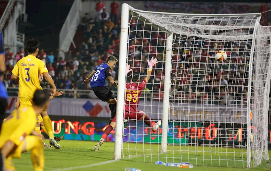 Ngọc Long ghi bàn mở tỷ số 1-0 cho CLB TPHCM. Ảnh: Nguyễn Hoàng(Thanhuytphcm.vn) - Bốn trận đấu muộn của vòng 1 V-League 2023/24 diễn ra và tối 22/10 với cuộc so tài đáng chú ý trên sân Thống Nhất giữa đội chủ nhà CLB TPHCM và Khánh Hòa. Đây là hai đội vốn từng tranh chấp trong cuộc đua trụ hạng ở mùa bóng trước và việc sớm gặp lại nhau trong trận khai mạc đã thu hút sự quan tâm của khán giả.