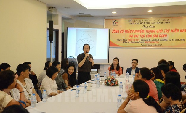 (Thanhuytphcm.vn) – Chiều 22/6, Nhà Văn hóa Phụ nữ TPHCM tổ chức tọa đàm “Sống có trách nhiệm trong giới trẻ hiện nay và vai trò của gia đình” với sự chủ trì của Tiến sĩ Phạm Thị Thúy, giảng viên Học viện Hành chính quốc gia và Thạc sĩ tâm lý Nguyễn Ngọc Duy, giảng viên thỉnh giảng khoa Tâm lý, giáo dục Trường Đại học Sư phạm TP. Đến dự có Chủ tịch Hội Liên hiệp Phụ nữ Việt Nam TPHCM Nguyễn Thị Ngọc Bích.