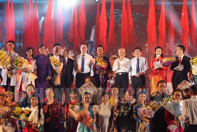 Lãnh đạo TP tặng hoa chúc mừng chương trình tại đầu cầu Hội trường Thống Nhất, Quận 1. Ảnh: Hương Thảo(Thanhuytphcm.vn) - Tối 21/1, cầu truyền hình đặc biệt kỷ niệm 50 năm cuộc Tổng tiến công và nổi dậy Xuân Mậu Thân 1968 “Bản hùng ca mùa Xuân: Chân trần - Chí thép” đã diễn ra đầy hùng tráng, xúc động kết nối 3 địa danh gắn liền với sự kiện năm nào là: Di tích Dinh Độc Lập - Hội trường Thống Nhất, Khu Tưởng niệm Cuộc Tổng tiến công và nổi dậy Xuân Mậu Thân 1968 tại xã Tân Nhựt, huyện Bình Chánh và Khu Tưởng niệm Liệt sĩ hy sinh trong Cuộc Tổng tiến công và nổi dậy Xuân Mậu Thân 1968 tại xã Bình Mỹ, huyện Củ Chi.