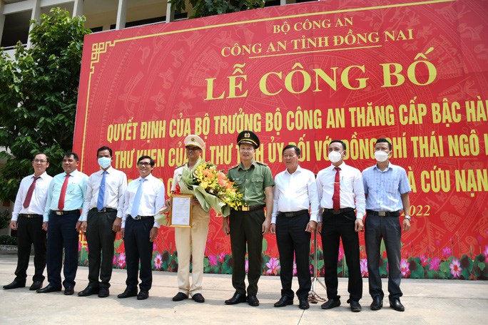 Công bố quyết định thăng quân hàm vượt cấp cho người hùng cứu 4 người đuối nước (Trong ảnh: Lãnh đạo UBND tỉnh Đồng Nai và Công an tỉnh Đồng Nai chúc mừng Đại úy Thái Ngô Hiếu). Ảnh: NLD.VN(Thanhuytphcm.vn) – Mấy ngày gần đây, báo chí, mạng xã hội đồng loạt thông tin khá dày về việc Trung úy Thái Ngô Hiếu (cán bộ Đội Chữa cháy và Cứu nạn, cứu hộ khu vực Trảng Bom - Phòng Cảnh sát Phòng cháy, chữa cháy và Cứu nạn, cứu hộ Công an tỉnh Đồng Nai) trong thời gian nghỉ phép đã kịp thời cứu được tính mạng của 4 người đang bị đuối nước tại bãi biển Vũng Tàu, ngày 10/4/2022. Chỉ 1 ngày sau, ngày 11/4/2022, Bộ trưởng Bộ Công an Tô Lâm đã ra quyết định thăng cấp bậc hàm vượt bậc từ trung úy lên đại úy đối với đồng chí Thái Ngô Hiếu. Đồng thời, Bí thư Tỉnh ủy Đồng Nai Nguyễn Hồng Lĩnh đã có thư khen và Chủ tịch UBND tỉnh Đồng Nai Cao Tiến Dũng tặng Bằng khen đột xuất đối với đồng chí Hiếu.